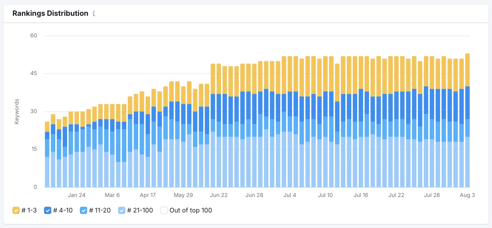 Additionally, 14 keywords rank in the top 3 positions, and 25 keywords are now on the first page of search results.