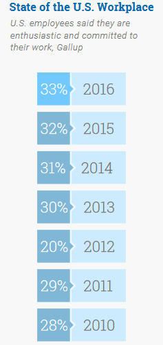 Especially when we are currently working with some dismal statistics. The number of enthusiastic employees has been edging up slightly over the past few years but it’s still low.