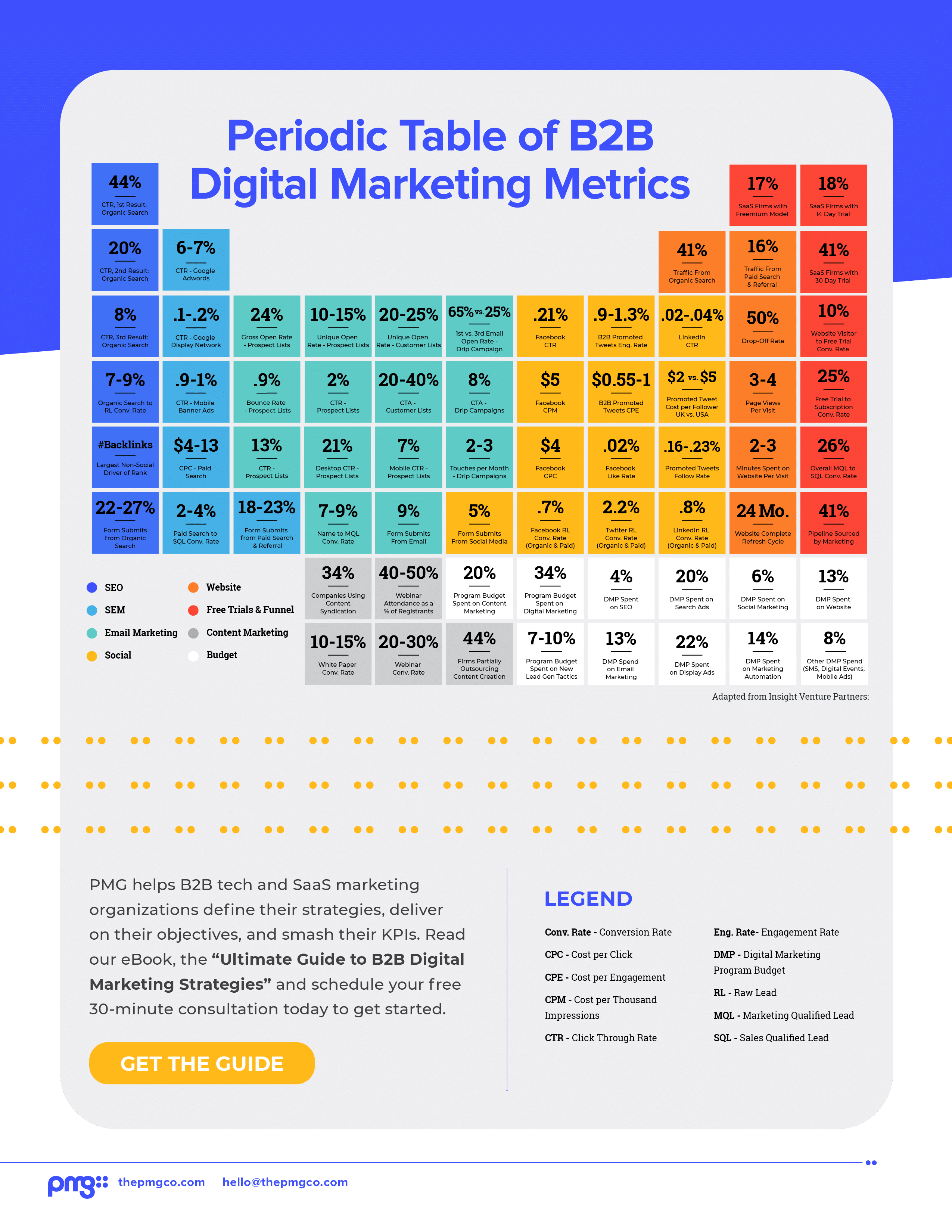 For a more detailed list of B2B Marketing Metrics, check out this periodic table of marketing metrics by pmg which goes into a little more detail and provides some benchmarks.