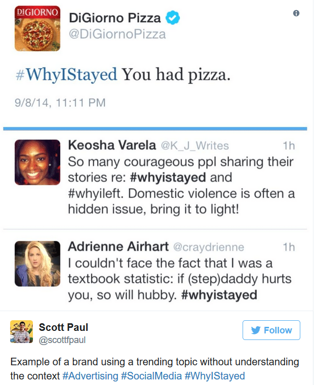 A lack of research can destroy a campaign. Take DiGiorno Pizza’s epic fail for example. The pizza brand didn’t research their chosen hashtag. As a result, they inadvertently interrupted a social media campaign to raise awareness about domestic violence.
