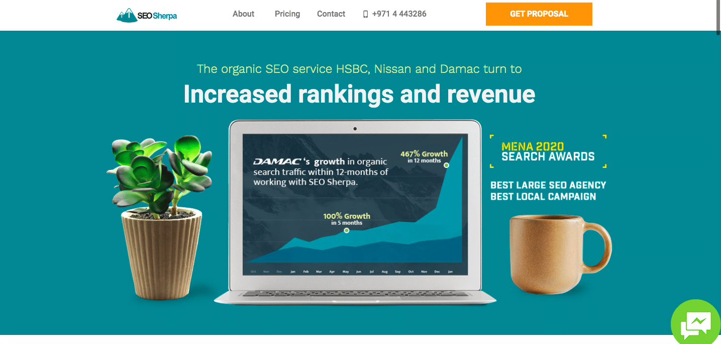 As well as an eye-catching image, they use the prime above-the-fold real estate to name-drop some of their biggest clients and awards.