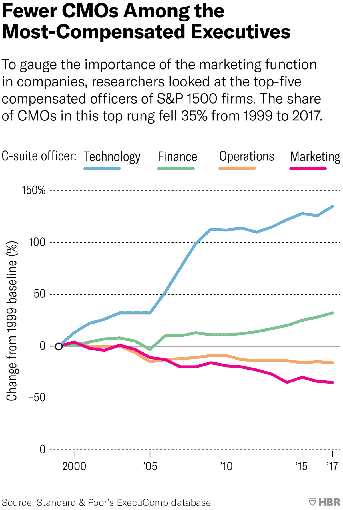 The report on c-suite salaries comes from a Harvard Business Review study. It was published in response to pushback from an earlier report on the assertion that marketing is becoming less important. HBR published an analysis indicating that advertising dropped from 1% of total expenditures in 1975 to 0.8% in 2017.