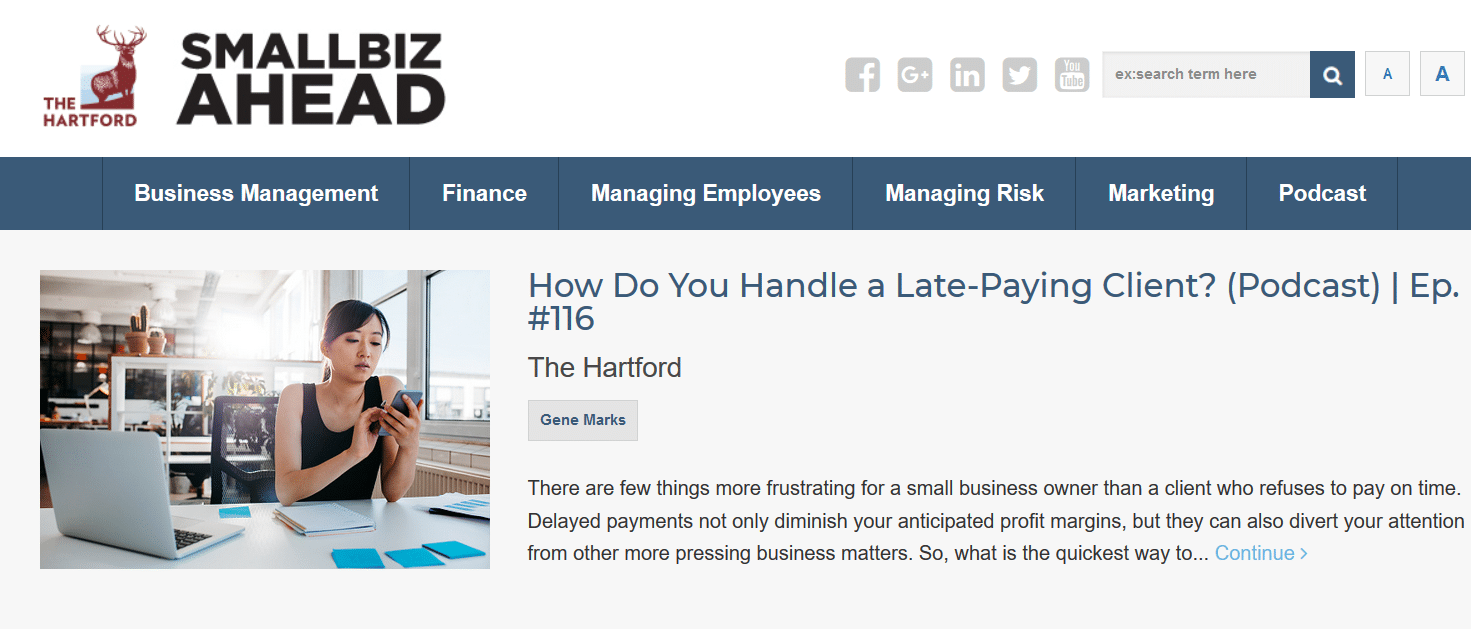 The Hartford Financial Services has a dedicated content hub for targeting small business owners. SmallBiz is packed with helpful articles on topics small business owners and entrepreneurs would be interested in, as well as a SmallBiz podcast.
